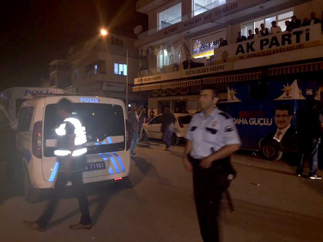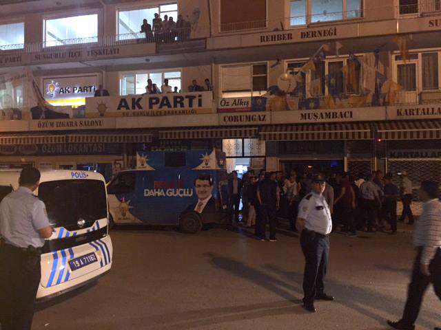 Ak Parti İlçe Başkanlığı önünde bekleyen bazı partililer, aracıyla parti binasının önünden geçerken bozkurt işareti yapan bir aracı durdurdu. Kısa süreli arbedenin yaşandığı olay Ak Parti İlçe Başkanı İlyas Özkan ve bazı partililerin araya girmesiyle önlendi. Parti önüne çok sayıda polis ekibi sevk edildi.