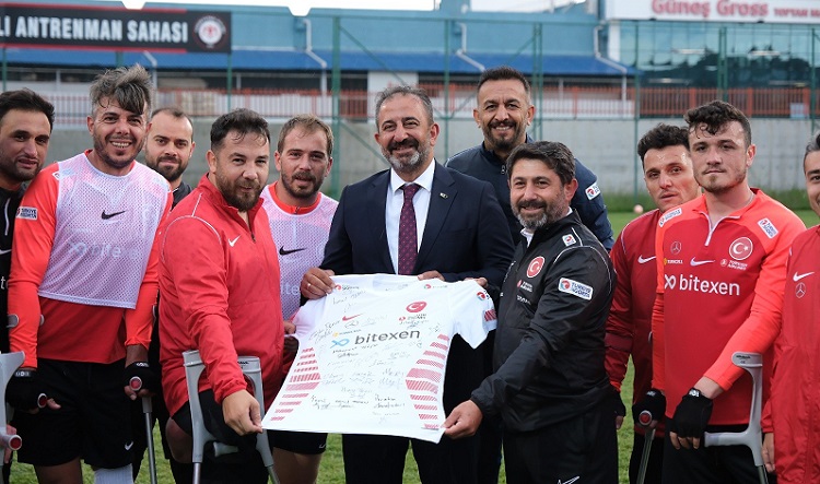 Yağbat “Şehrimizde ağırladığımız Dünya Şampiyonumuz Ampute Futbol Milli Takımımızı kampın son günlerinde ziyaret ettik. Teknik Direktör İsmail Temiz hocamıza ve milli sporcularımıza, 1-8 Haziran tarihlerinde Fransa’da gerçekleşecek olan Avrupa Şampiyonası’nda başarılar diliyoruz.” dedi. Teknik Direktör İsmail Temiz de Belediye Başkan Vekili İsmail Yağbat’a imzalı milli takım forması hediye etti.