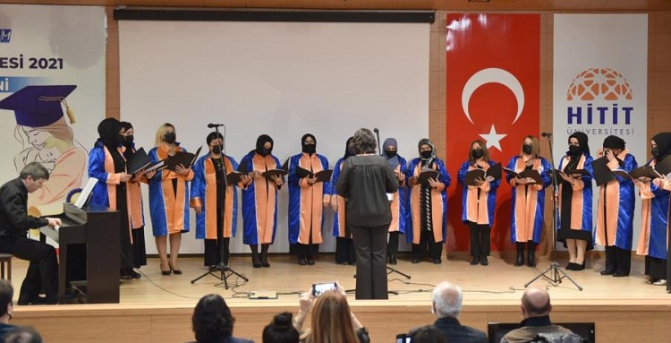 Hitit Anne Üniversitesi 2021 dönem mezunları arasında 76 yaşındaki Esma Dalgıç’ın da bulunduğunu belirten Prof. Dr. Öztürk, “İlerlemiş yaşına rağmen, eğitimin, öğretimin yaşı olmadığını bizlere göstermesi, bu şekilde örnek olması anlamında Esma Annemizi tebrik etmek isterim. Kendisi, dışarıdan ortaokulu bitirip, şimdi açık öğretim lisede eğitim hayatına devam ederken, üniversitemizin de bir ferdi olarak yüksek öğretimin de yavaş yavaş üniversite ortamında eğitim anlamında alışmaya çalışıyor. Bu gayretiyle bizi gururlandırıyor. Onu özellikle tebrik ederek, bu yıl 2021 mezunu olan bütün annelerimizin, anne adaylarımızın mezuniyetlerini kutluyorum” şeklinde konuştu. Konuşmaların ardından, Üniversitemiz Güzel Sanatlar Tasarım ve Mimarlık Fakültesi Müzik Bölümü öğretim elemanları tarafından hazırlanan Hitit Anne Üniversitesi 2021 Korosu, müzik dinletisi sundu. Tören, Hitit Anne Üniversitesi 2021 Programını başarıyla tamamlayan 20 anne ve anne adaylarına diplomalarının verilmesiyle sona erdi. Diplomalarını alan anne ve anne adayları, kep atarak mezuniyet sevincini yaşadı. (İHA)