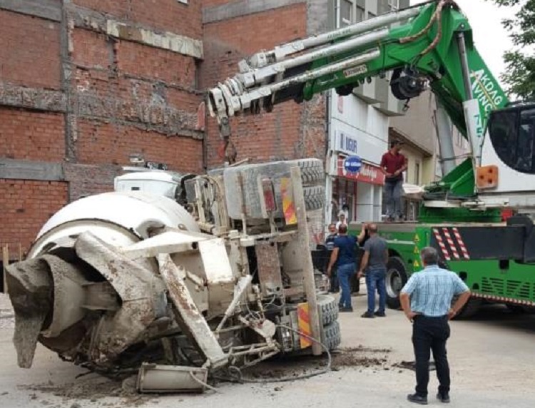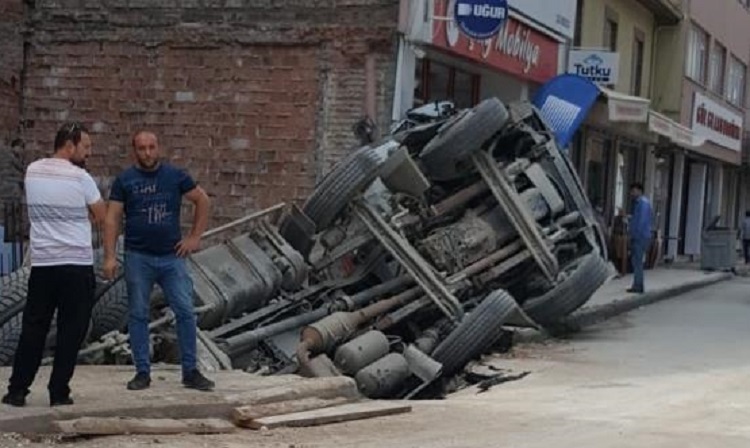 Çorum’da bir inşaat alanında, asfaltın çökmesi sonucu beton mikseri temelin içine devrildi. Kaza, Çepni Mahallesi Taşhan Caddesi’nde meydana geldi. Edinilen bilgilere göre, bir inşaat alanına beton getiren mikser, zeminin çökmesi sonucu devrildi. Kaza ucuz atlatılırken, mikser kamyonu olay yerine çağırılan vinç yardımı ile devrildiği yerden çıkarıldı.