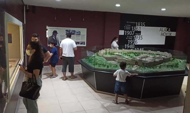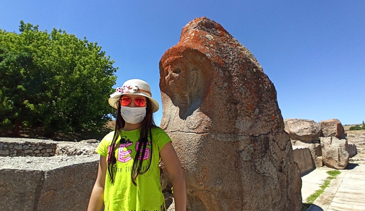 Son Güncelleme: 3 Ağustos 2020 16:05 Alacahöyük’e tarihi tanıklık etmek isteyen ziyaretçiler için her türlü tedbir alındı. Korona virüs tedbirleri kapsamında sık sık dezenfeksiyon işlemi yapılan ören yeri ve müzede, ziyaretçiler arasındaki sosyal mesafeyi belirleyen işaretler yer alıyor. Bilet noktasından biletini alan ziyaretçiler, ateşleri ölçülüp maskelerini taktıktan sonra içeriye girebiliyor. Müze içerisinde dezenfektan ve hijyen noktaları oluşturulurken, ziyaretçiler için korona virüsle mücadele de 14 altın kuralın yer aldığı bilgilendirme panoları yer alıyor. Eski Tunç Çağı ve Hitit çağında çok önemli bir kült (dini tören) ve sanat merkezi olan Alacahöyük’te bugüne kadar yapılan kazılarda 4 uygarlık çağı açığa çıkartıldı. Tunç çağına ait 13 kral mezarının da bulunduğu Alacahöyük yerli ve yabancı turistlerin en çok ziyaret ettiği ören yerleri arasında yer alıyor. İHA