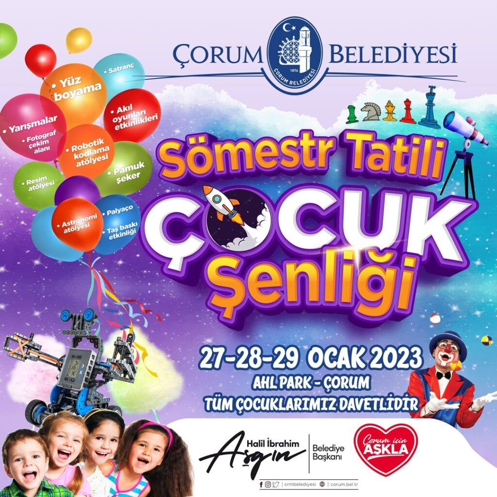 Sömestr tatili, Çorum Belediyesi’nin düzenlediği “Çocuk Şenliği” etkinlikleriyle dolu dolu geçecek. Her yaştan insana hitap eden sosyal ve kültürel etkinlikler düzenleyen Çorum Belediyesi, çocukları da unutmuyor. AHL Park’ta üç gün boyunca gerçekleşecek olan “Çocuk Şenliği” kapsamında; yarışmalar, resim atölyesi, astronomi atölyesi, robotik kodlama atölyesi, palyaço, taş baskı etkinliği, akıl oyunları etkinlikleri, satranç ve yüz boyama etkinlikleri yapılacak. Çocuklara pamuk şeker ikramının da yapılacağı etkinlikler 27-28-29 Ocak tarihlerinde 15.00 ile 19.00 saatleri arasında gerçekleşecek. Katılımın ücretsiz olduğu etkinliklere tüm çocuklar davet edil