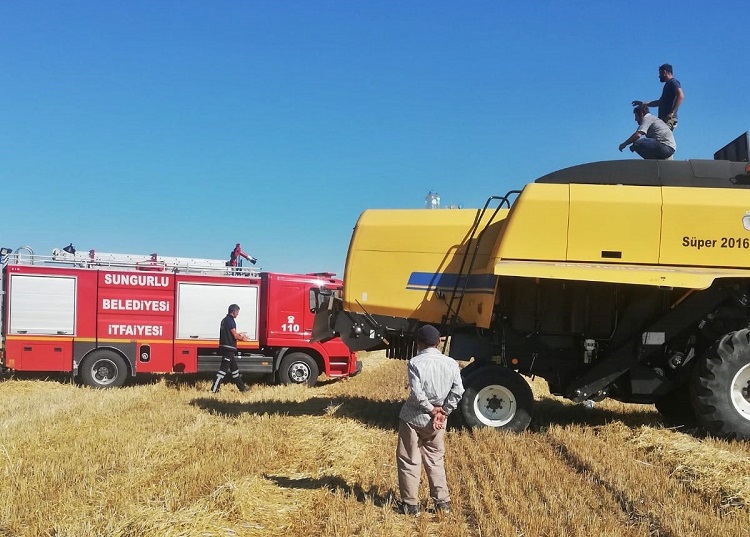 Son Güncelleme: 1 Temmuz 2020 13:04 Edinilen bilgilere göre Boğazkale yolunda Cengiz Ambarkütük’e ait buğday tarlasını biçen Şerafettin Küçük’ün kullandığı biçerdöver, bir anda motor kısmından alev aldı. Kendi imkanlarıyla alevleri söndüremeyen biçerdöver sahibi, itfaiyeden yardım istedi. Kısa sürede olay yerine gelen Sungurlu belediye İtfaiye ekiplerinin müdahalesi ile biçerdöver yanmaktan son anda kurtarıldı. (İHA)