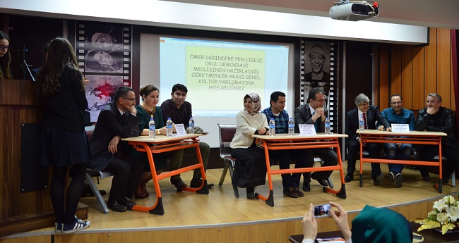 İlçe Milli Eğitim Müdürü Mahmut Tökel’in de yarışmacı olduğu etkinlikte öğrenciler sordu, öğretmenler ter döktü. Okullarda bilgi yarışması hep öğrencilerarası düzenlenirdi. Dereceye giren öğrenciler Milli Eğitim Müdürlüğü tarafından ilçe genelinde düzenlenen bilgi yarışmalarında okulunu temsil etme hakkı kazanırdı. Hep öğretmenlerin sorduğu, öğrencilerin terlediği bilgi yarışması kültüründe bu defa bir ilk yaşandı. Öğrenciler sordu, öğretmenler doğru cevabı vermek için yarıştı. Etkinliğe Ömer Derindere Fen Lisesi Öğrenci Demokrasi Meclisi imza attı. Bilgi yarışması için gönüllü 9 öğretmen seçildi. Gönüllülerin arasında İlçe Milli Eğitim Müdürü Mahmut Tökel de vardı. Yarışma soruları da Öğrenci Meclisi tarafından hazırlandı. Bilgi yarışmasında Rehber Öğretmeni Recai Akıllı, Tarih Öğretmeni Bahattin Uysal ve İngilizce Öğretmeni Hülya Sarıdaş’ın yer aldığı B Grubu, 20 sorudan 18’ine doğru cevap vererek birinci oldu. İlçe Milli Eğitim Müdürü Mahmut Tökel, böyle bir yarışmaya katılmaktan çok mutlu olduğunu belirterek etkinliğin öğrenci-öğretmen kaynaşmasına katkı sağlayacağını ifade etti. Tökel, etkinliği hazırlayan öğrencileri ve yarışmaya katılan öğretmenleri tebrik ederken öğrenci meclisi yarışmaya katılan öğretmenlere çeşitli armağanlar verdi. İHA