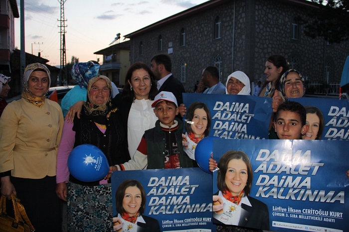 Ziyaretin ardından belde halkına hitap eden İlksen Ceritoğlu, 7 Haziran seçimlerinde AK Parti’ye destek istedi. Program boyunca Ceritoğlu’nu her yerde olduğu gibi yine kadınlar yalnız bırakmadı. Ceritoğlu’na sevgi gösterisinde bulunan kadınlar, Çorum’dan meclise bir kadın milletvekili göndermek için çalışacaklarının sözünü verdiler.