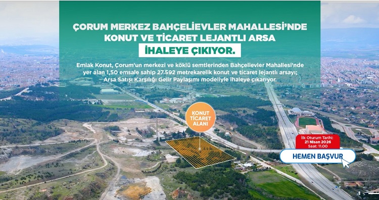 Çevre, Şehircilik ve İklim Değişikliği Bakanı Murat Kurum’un Çorum ziyareti sırasında Nisan ayında yapılacağını açıkladığı çimento fabrikası arazisine yönelik ticaret ve konut projesinde süreç resmiyet kazandı. Emlak Konut GYO tarafından yapılan açıklamayla ihalenin tarihi netleşti. Emlak Konut Gayrimenkul Yatırım Ortaklığı, Çorum Merkez Bahçelievler’de bulunan eski çimento fabrikası arazisinde hayata geçirilecek proje için “Arsa Satışı Karşılığı Gelir Paylaşımı İşi” ihalesinin 1. oturumunun 21 Nisan 2026 Salı günü saat 11.00’de gerçekleştirileceğini duyurdu. Açıklamada, Çorum Beltaş Enerji Ulaşım Eğitim Spor ve İnşaat Hizmetleri A.Ş. ile imzalanan iş birliği protokolü kapsamında yürütülecek projenin, şehrin önemli dönüşüm alanlarından biri olacağı vurgulandı.