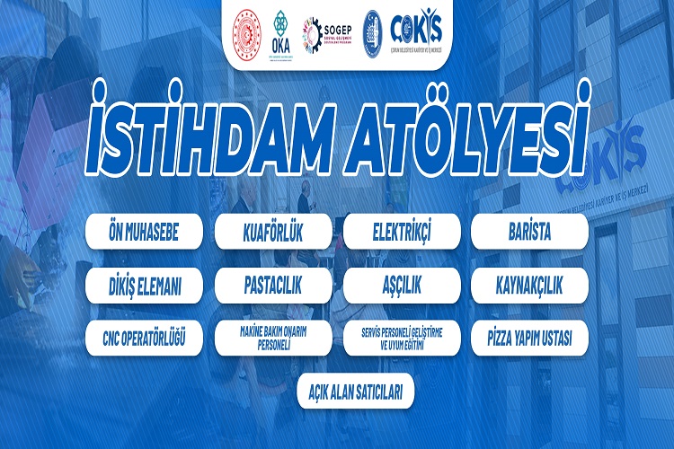 Çorum Sanayisinde ihtiyaç olduğu tespit edilen alanlara yönelik açtığı kurslarla kalifiye eleman istihdamına ve işsizliğe çözüm olan ÇOKİŞ, “İstihdam Atölyeleri” adıyla 13 alanda daha kurs açıyor. Orta Karadeniz Kalkınma Ajansı(OKA) işbirliğiyle açılacak olan ön muhasebe, kuaförlük, elektrikçi, barista, dikiş elemanı, pastacılık, aşçılık, kaynakçılık, cnc operatörlüğü, makine bakım onarım