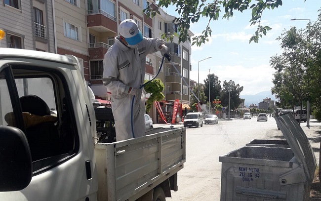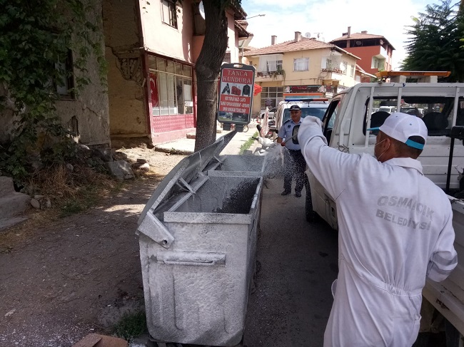 Osmancık Belediyesi Temizlik işleri Müdürlüğü ekipleri ilçedeki çöp konteynırlarını yaz aylarında oluşabilecek koku ve diğer risklere karşı sık sık dezenfekte ediyor.