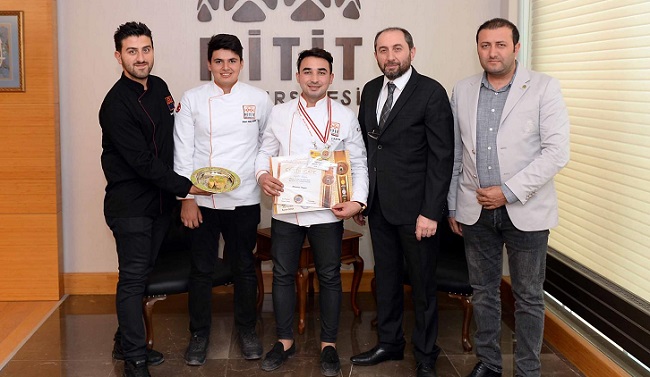 Son Güncelleme: 6 Mayıs 2019 14:54 Hitit Üniversitesi Alaca Avni Çelik Meslek Yüksekokulu Otel Lokanta ve İkram Hizmetleri Bölüm Başkanı Öğr. Gör. Remzi Bilgili öncülüğünde Aşçılık Programı öğrencilerinden Mehmet Kaya, Hamza Tarhan, Ahmet Atalay Akdağ ve Turan Dönmez, Mustafa Kemal Atatürk’ün Samsun’a çıkışının 100. Yılı şerefine Samsun’da düzenlenen 3. Uluslararası Mater Of Cake Samsun Pastacılık & Çikolata Festivali ile Pasta Yarışmasına katıldı. Alaca Avni Çelik MYO Aşçılık Programı öğrencilerinden Mehmet Kaya, yarışmada kültürel mirasa saygı ve genç nesillere kültürümüzün aktarılması amacıyla düzenlenen Yöresel Lezzetler kategorisinde Çorum’a has olan “Çorum Baklavası” ile ikinciliği elde ederek gümüş madalya kazandı. Uluslararası profesyonel yarışmacıların katıldığı ve değerlendirmelerde ise uluslararası jüri üyelerinin yer aldığı yarışma ve festivale Nijerya, Hırvatistan, Sırbistan, Azerbaycan, Kuzey Kıbrıs Türk Cumhuriyeti, Slovenya ve Türkiye’den 16 kategori başlığı altında 150 yarışmacı katıldı. Ayrıca festival kapsamında 132 adet de pasta yapıldı. Çorum beşlisinden (düğün çorbası, et yahni, su böreği, pilav ve Çorum baklavası) birisi olan Çorum baklavası, genellikle düğün ve bayramlarda ikram edilir. Çorum Has Baklavası; 50 kattan oluşur, fırında 125 derecede 4-5 saat pişirilir, Gül Burma ve Burma Baklava çok kızarmamış ve altın sarısı özelliğinde olmasının yanı sıra hafif ve az şerbetli olması ile bilinir.