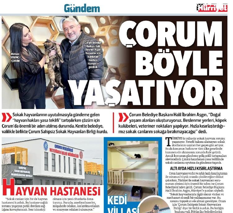 Hürriyet Gazetesi “Can Dostlara Çorum Modeli” manşetiyle Çorum’da yapılan çalışmaları okurlarına aktardı. Sahipsiz Sokak Hayvanları Birliği projesi, Hayvan Hastanesi, Kedi Villası ve Hulk Mama projesi gibi çalışmalardan bahsedilen haberde, Çorum Türkiye’ye örnek gösterildi.