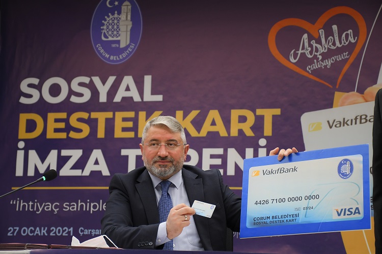 Çorum Belediyesi, kentteki ihtiyaç sahibi ailelere sosyal yardımda bulunmak üzere “Sosyal Destek Kartı Projesi”ni hayata geçirdi. Proje kapsamında ihtiyaç sahibi ailelere dağıtılmak üzere Vakıfbank aracılığıyla kullanıcısının kimlik bilgilerinin tanımlı olduğu kart geliştirildi. Yerel esnafı da desteklemek amacıyla Çorum Bakkallar ve Bayiler Odası iş birliğiyle kent merkezinde Sosyal Destek Kartı’nın kullanılabileceği 50 yerel markette altyapı oluşturuldu. Kart sahipleri, belediye yetkililerince belirlenen asgari 175 liralık Sosyal Destek Kartı ile yerel marketlerden temel ihtiyaçlarını karşılayabilecek. Belediye Başkanı Halil İbrahim Aşgın, Turgut Özal Konferans Salonu’nda düzenlenen Sosyal Destek Kart Projesi tanıtım toplantısında yaptığı konuşmada, bunun Türkiye’de henüz 5-6 belediyede uygulanan bir sistem olduğunu söyledi.
