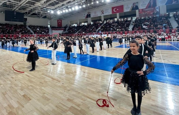 Programda öğrenciler, Kahramanmaraş’ın Onikişubat ilçesinde okula düzenlenen silahlı saldırıda hayatını kaybeden öğretmen ve öğrencileri andı. Öğrenciler, matematik öğretmeni Ayla Kara ve öğrencilerinin fotoğraflarının yer aldığı “Sizi unutmayacağız” yazılı pankart açıldı. (İHA)