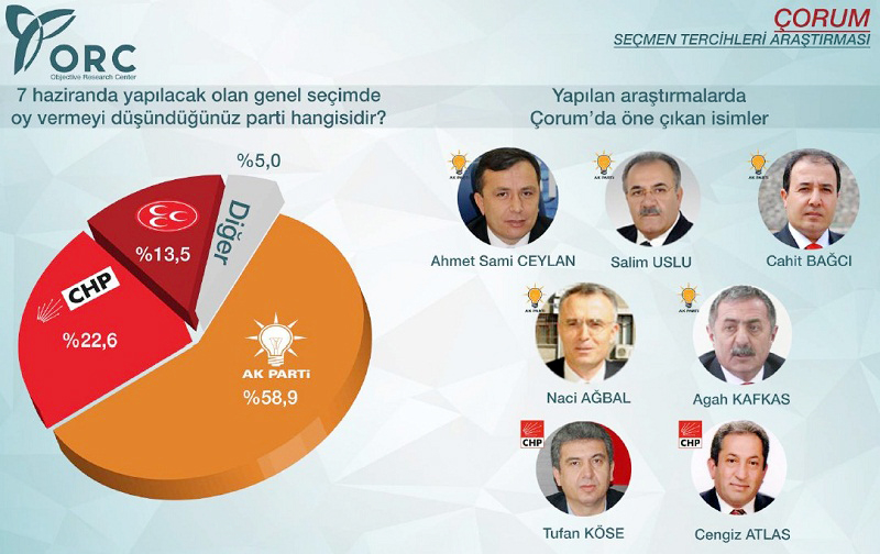 Çorumlu seçmene sorulan “7 Haziran’da yapılacak olan genel seçimde oy vermeyi düşündüğünüz parti hangisidir?” sorusuna verilen cevaplarda AK Parti’nin oyu yüzde 58,9 ile yine birinci sırada yer aldı. Çorum’da AK Parti’yi yüzde 22,6 ile CHP takip ederken üçüncü sırada yüzde 13,5 ile MHP yer aldı.