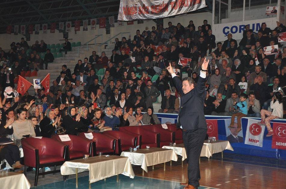 Son Güncelleme: 23 Mart 2015 18:31 MHP Çorum İl Başkanlığı aday adaylarını tanıttı. Atatürk Spor Salonu’nda düzenlenen tanıtım gecesine MHP İl Başkanı Bekir Çetin, Merkez İlçe Başkanı Sinan Özcan, parti yöneticileri, ilçe teşkilat başkanları ile yüzlerce partili katıldı. Spor salonunu dolduran partililer, program süresince coşkularını zirvede tutarak sık sık adaylarına tezahürat yaptılar. Saygı duruşu ve İstiklal Marşı’nın okunması ile başlayan programın açılış konuşmasını İl Başkanı Bekir Çetin yaptı. Açış konuşmasının ardından sinevizyon gösterisi, semazen gösterisi, Merzifon Belediyesi Mehteran takımının konseri, adayların tanıtımı, Murat İnce şiir dinletisi ve kapanış yapıldı.Partisinden istifa ederek MHP’ye katılan Av. Muhsin Kocasaraç, bazı DP İlçe Başkanlarının rozetini MHP İL Başkanı Bekir Çetin taktı. Tanıtım toplantısında yapılan açıklamada DP’den yaklaşık 350, AK Parti’den ise 30 kişilik ekibin MHP’ye katıldığı söylendi.