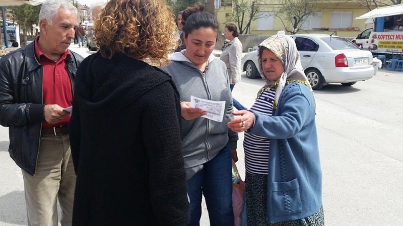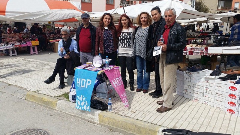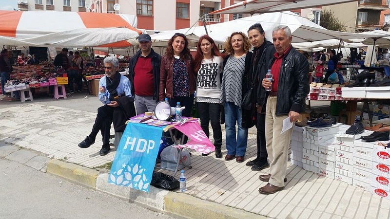 HDP’nin iki kadın milletvekili adayı Hasibe Beyaz ve Meliha Üşüdür, hafta sonu Cumartesi Pazarı’nda hem esnafla hem de pazar alışverişi yapan vatandaşlara partilerinin seçim broşürlerini dağıttılar. Seçimlerde HDP’ye destek vereceğini açıklayan EMEP’in Merkez İlçe Başkanı Feyzullah Aygün ile HDP Merkez İlçe Başkanı Mustafa Sazak ile her iki partiden yönetici ve üyelerin de hazır bulunduğu bildiri dağıtımında vatandaşlardan 7 Haziran’da sandık başında HDP’ye oy vermeleri istendi.