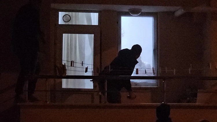 S.K’nin telefonla aradığı kuzeninin ihbarı üzerine olay yerine polis, sağlık ve itfaiye ekipleri sevk edildi. Çevrede geniş güvenlik önlemi alan polis ekipleri, şüpheliyi ikna etmeye çalıştı. İkna olmayan şüpheli ile S.K. arasında arbede çıktı. Bu sırada balkondan eve giren polis ekipleri, biber gazı kullanarak zanlıyı etkisiz hale getirdi. Yaklaşık 2 saat süren operasyonda gözaltına alınan şüpheli, polis merkezine götürüldü. (AA)