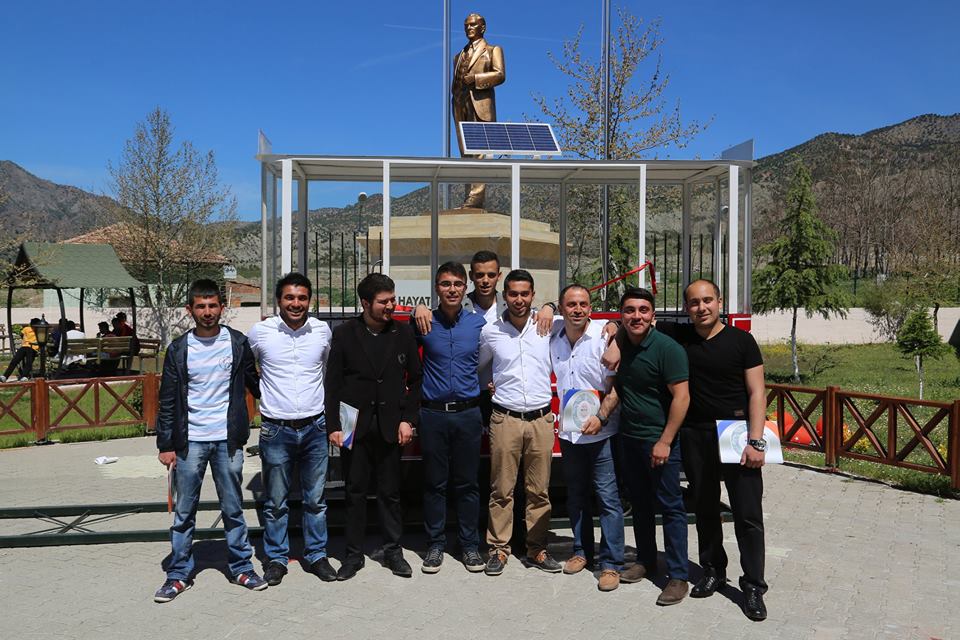 hititray çorum (4)ÇORUM Hitit Üniversitesi Osmancık Ömer Derindere Meslek Yüksekokulu’nda öğrenim gören 9 öğrenci, güneş enerjisiyle şarj olan ve akıllı telefonlarla da kontrol edilebilen 20 kişilik tramvay yaptı…