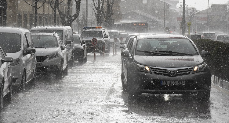 Çorum’da etkili olan şiddetli yağış, hayatı olumsuz etkiledi. Günün erken saatlerinde hafif sağanak şeklinde başlayan yağış, öğleden sonra şiddetini artırdı. Akşam saatlerinde kısa süreli dolunun da etkili olduğu kentte yağışa hazırlıksız yakalananlar zor anlar yaşadı. Bir anda şiddetini artıran yağış nedeniyle bazı cadde ve sokaklarda su birikintileri oluşması nedeniyle trafik aksadı. Çorum Belediyesine bağlı ekipler, su baskını yaşanan yerlere müdahale etti. (AA)