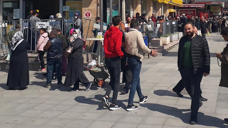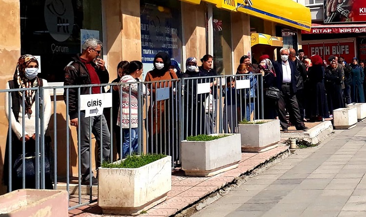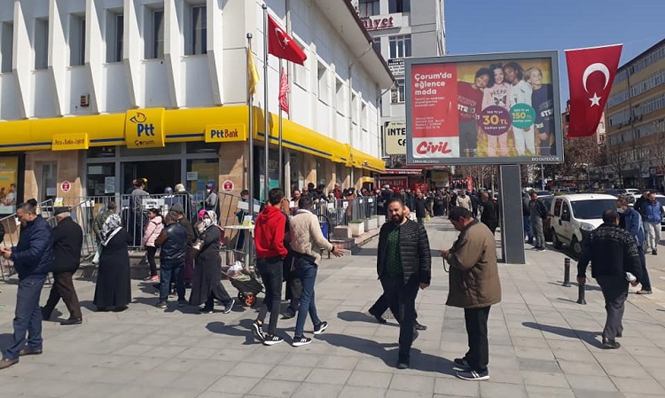 Aile, Çalışma ve Sosyal Hizmetler Bakanlığı’nın koronavirüs kapsamında başlattığı 1000’er liralık ödemelerin başlamasıyla birlikte Çorum’da PTT önünde uzun kuyruklar oluştu