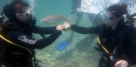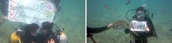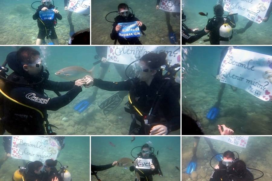 Muğla Valiliğinde görevli memur Osmancıklı Abdulbaki Kılıç, 1,5 yıl önce tanıştığı Zerrin Kurt’a, ilk kez gerçekleştirdikleri dalış sırasında açtığı pankartla evlenme teklif etti.