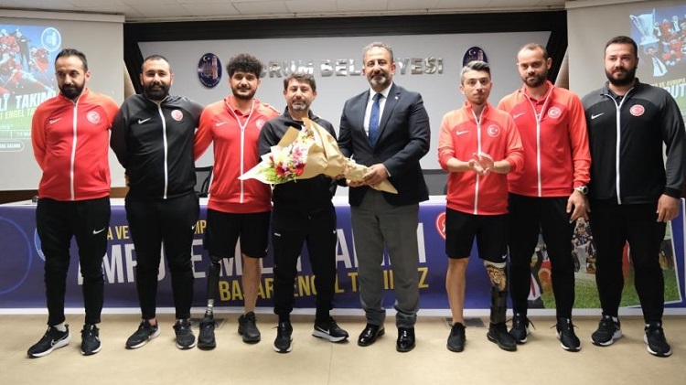 Ampute milli takım oyuncularından Şehmuz Erdinç ise, engellilerin neleri başardığını dünyaya gösterdiklerini belirterek, “Türkiye’de ampute futbol biraz hızlı gelişti. Bu işe medyanın büyük desteği oldu. Avrupa şampiyonu olduğumuzda gündeme geldik. Sosyal medyanın ve medyanın etkisi çok büyük. Bizler kimsenin engelli olmasını istemiyoruz. Ancak doğuştan engelli vatandaşlarımız, sonradan engelli olan vatandaşlarımızın neler başarabileceğini insanlara göstermiş olduk. Sadece Türk halkına değil dünyaya da göstermiş olduk. Bizi çok sevmeyen Avrupa’ya da göstermiş olduk. İki kez Avrupa şampiyonu olduk. Üçüncü Avrupa şampiyonluğuna gidiyoruz. Bizi gerçekten nefret derecesinde sevmiyorlar. Ama biz ay-yıldızlı bayrağımız için, onu göndere çekip İstiklal Marşımızı okutmak için elimizden geleni yapacağız” dedi. Program sonra Belediye Başkan Vekili İsmail Yağbat, söyleşiye katılan Teknik Direktör İsmail Temiz, Barış Telli, Emin Tiryaki, Umutcan Günay, Coşkun Peker, Şehmuz Erdinç ve Erdi Arslan’a çiçek verdi. (İHA)