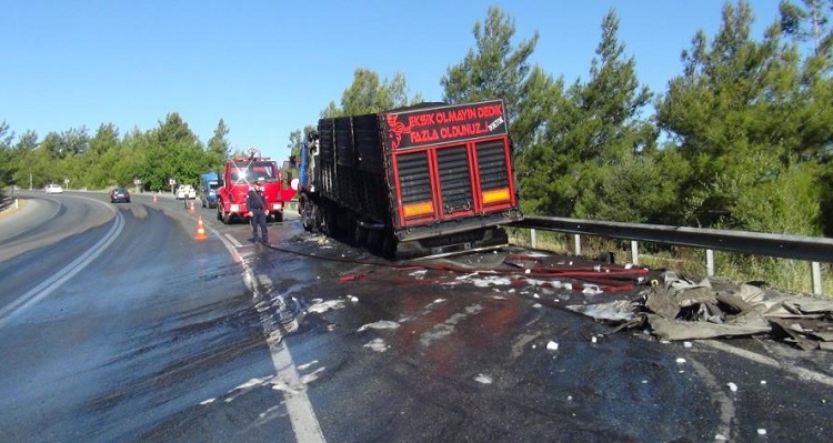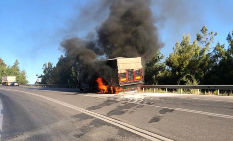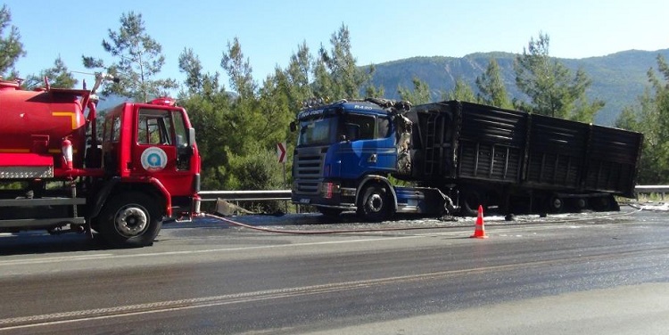 Antalya’da seyir halindeyken lastiği patlayan ve alev alan tır küle döndü. Olay, Manavgat ilçesinde bu sabah yaşandı. Edinilen bilgiye göre, Çorum’dan yüklediği toprak katkı maddesi ‘leonardit’i Gazipaşa’ya götürmekte olan Hasan Akdanalı’nın kullandığı 19 UF 999 plaka ve 19 US 999 dorse plakalı tır, Akseki-Manavgat D-695 karayolunda Ahmetler kavşağını geçtikten sonra lastiğinin patlaması sonucu yanmaya başladı. Tır şoförü Hasan Akdanalı aracı yolun sağına çekerek indiğinde patlayan lastiğin alev aldığını görünce yangın tüpüyle müdahalede bulundu. Yoldan geçen diğer araç sürücülerinin de müdahale ettiği yangın büyümeye devam etti. Antalya Büyükşehir Belediyesi İtfaiyesi ve Orman İşletmesine ait arazözlerin müdahalesi sonucunda yangın söndürülürken araçta büyük hasar meydana geldi.