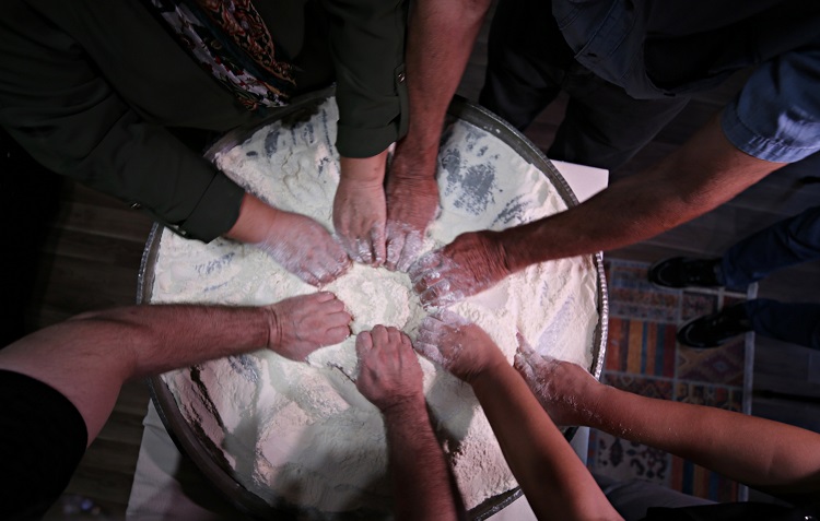 “Biz bugün 25 kişilik teltel tatlısı yaptık. Bunun için 700 gram şeker, 350 gram su, 2 damla limon kullandık. Bunu ağda kıvamına getirmek için 2 saate yakın kaynattık. Burada kaynatma süresini şekerin kristalize olmaması için iyi ayarlamamız gerekiyor. Kaynattıktan sonra tepsiye döküp donmasını bekliyoruz. Donup ağda şekline gelince tepsiden alıp oynama işlemini yapıyoruz. Bu aşamada sarı renkteki şeker, beyaz rengini alıyor. Diğer taraftan 3 kilo unu kavuruyoruz ve oynadığımız ağdayı halka şekline getirip una yatırıyoruz. 3-4 kişi imece usulüyle çekme işlemini yapıyor. Yaklaşık 30 defa yuvarlak hale getirerek çektikten sonra dinlendirip servise hazır hale getiriyoruz.”