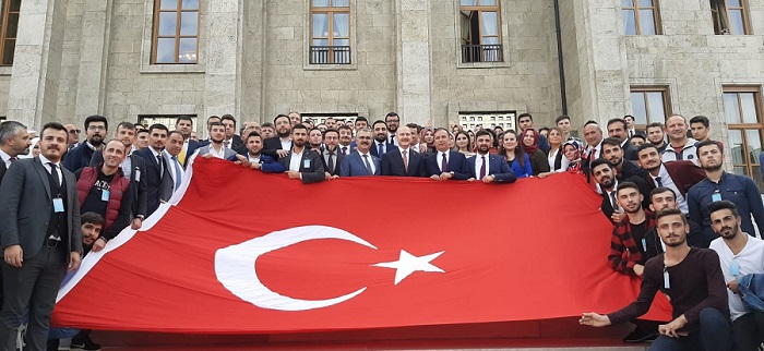 Toplantıda Cumhurbaşkanı Yardımcısı Fuat Oktay’a, Çorum ve Çorumlu için büyük önem taşıyan havalanı, demiryolu, acemi birliği ilgili büyük projenin bulunduğu detaylı bir dosya sunuldu. Toplantıda AK Parti Çorum Millletvekili ve MKYK üyesi Ahmet Sami Ceylan, Belediye Başkanı Halil İbrahim Aşgın, AK Parti İl Başkanı Yusuf Ahlatcı, Merkez İlçe Başkanı Erhan Akar, ilçe ve belde belediye başkanları ile parti yönetim kurulu üyeleri katıldı. Adalet ve Kalkınma Partisi’nin yeni yasama yılında düzenlediği ilk TBMM Grup Toplantısı’na Çorum Teşkilatları damga vurdu. Türk Silahlı Kuvvetleri tarafından sürdürülen Barış Pınarı Harekatı’na destek ve Cumhurbaşkanı Recep Tayyip Erdoğan başta olmak üzere devlet yetkililerine moral vermek amacıyla İl Başkanı Yusuf Ahlatcı öncülüğünde Ankara’ya çıkarma yapan Çorum heyeti, Cumhurbaşkanı Yardımcısı Fuat Oktay’ı ziyaretinin ardından TBMM’ye de giderek AK Parti Grup Toplantısı’na da katıldı. TBMM’de düzenlenen yeni yasama yılının ilk grup toplantısını, İl Başkanı Yusuf Ahlatcı, MKYK Üyesi ve Çorum Milletvekili Ahmet Sami Ceylan ile birlikte milletvekili sıralarında izlerken, ilçe başkanları, belediye başkanları, il gençlik ve kadın kolları başkanları, yönetim kurulu üyeleri ve merkez ilçe mahalle teşkilatları yöneticileri de grup salonunun tamamına yakınını doldurdu. Salona giren Milli Savunma Bakanı Hulusi Akar’ı “Şehitler Ölmez Vatan Bölünmez”, “Çorum seninle gurur duyuyor” gibi sloganlar atarak karşılayan Çorum heyetinin coşkusu Cumhurbaşkanı Erdoğan salona girdiğinde ise doruğa ulaştı. Cumhurbaşkanı Erdoğan’a sevgi gösterilerinde bulunan Çorum heyeti daha sonra Erdoğan’ın gurup konuşmasını dinledi. Çorum heyetine el sallayarak karşılık veren Cumhurbaşkanı Erdoğan, Azerbaycan’da katıldığı Türk Dünyası Konseyi Toplantısı başta olmak üzere ülkemizde ve dünyada yaşanan bir çok gelişmeye değinerek konuşmasında “5 devlet bir millet” vurgusu yaptı. Erdoğan, Barış Pınarı Harekatı’nın başarıyla devam ettiğini, hiç kimsenin Türkiye’nin taammüden hedef aldığı tek bir sivili bile gösteremeyeceğini, PKK/YPG ile birlikte DEAŞ ve FETÖ ile mücadeleyi sürdüreceklerini sözlerine ekledi. (İHA)