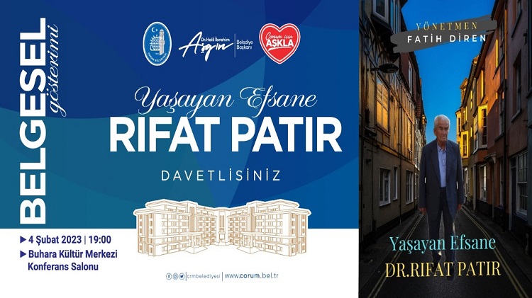 Çorum Belediyesi’nin katkılarıyla çekilen belgeselle Çorum’un yaşayan kültür değerleri arasında yer alan Rıfat Patır’ın hayatının belgesel haline getirilmesini önemsediklerini ifade eden Belediye Başkan Vekili İsmail Yağbat, Buharaevler Kültür Merkezi Konferans Salonu’nda saat 19.00’daki gösterime tüm Çorum halkını davet etti.
