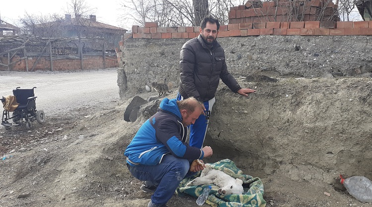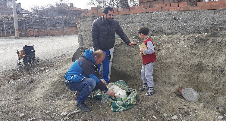 Son Güncelleme: 25 Ocak 2020 12:14 Çorum’un Osmancık İlçesi Esentepe Mahallesi’nde bulunan ve arka ayakları tutmayan sokak köpeğine engelli genç her gün yemek ve su veriyor. Osmancık Esentepe Mahallesi’nde yaşayan sağ ayağında ortez, sol bacağında protez bulunan 29 yaşındaki Erkan Dündar sokakta bulduğu ve arka ayakları tutmayan felçli köpeği sahiplendi. Hareket edemeyen ve bakıma muhtaç köpeğin yemek ve su ihtiyacını gidermek için günde 2 defa ziyaret ettiklerini belirten yüzde 63 engelli raporu bulunan Erkan Dündar, “ Bir hafta önce kuzenim Şeref Dündar ile birlikte mahallemizde gezerken, bir köpeğin arka ayakları tutmadığı için sürünerek yürüdüğünü gördük. Yaralı köpeğin 1 aydan fazla süredir bu durumda olduğunu ve mahalle sakinlerinin daha önce veterinere gösterdiği bilgisine ulaştım. Şuanda köpek bir ev temelinde battaniye içerisinde yaşıyor. Sürünerek yürümeyi de bıraktı, hiç ayağa kalkamıyor, nefes alıp vermesinin de zorlandığını görüyoruz. Bir sabah bir akşam her gün günde 2 defa gelerek yemek ve su veriyoruz. Mahalle sakinleri ilgileniyor bizde bakıyoruz ama durumu her geçen gün kötüye gidiyor. Veteriner tarafından tedavi edilmesi gerekiyor. “dedi. (İHA)