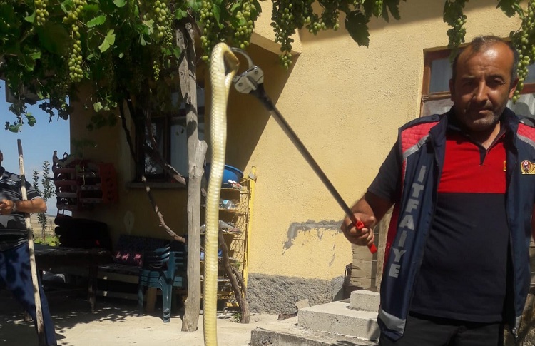 Çorum’un Bayat ilçesinde bir eve giren yılan panik yarattı. Yılanı kendi imkanlarıyla çıkarmaya çalışan ev sakinleri, başarılı olamayınca Bayat Belediyesi itfaiyesinden yardım istedi. Eve gelen ekipler, yılanı özel aparat ile yakaladı. Yaklaşık 2 metre uzunluğunda olan yılan mahalleye uzak bir noktada doğaya salındı.