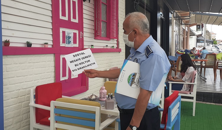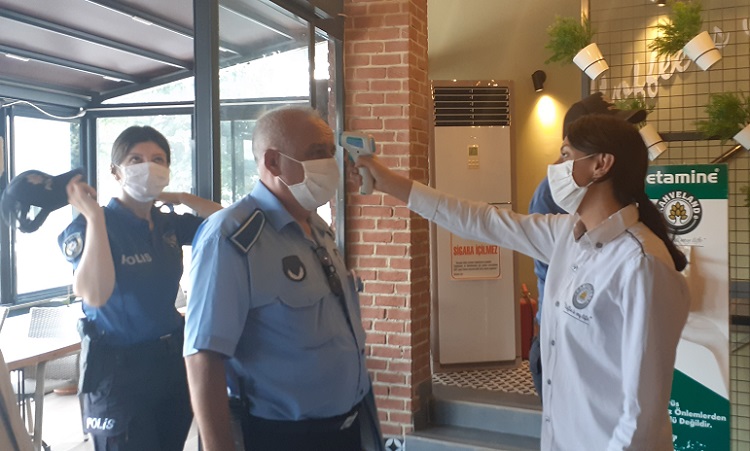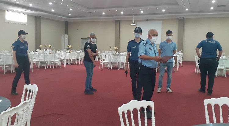 Son Güncelleme: 9 Temmuz 2020 13:56 Çorum’un Osmancık ilçesinde İçişleri Bakanlığının genelgesi doğrultusunda ‘maske, fiziki mesafe ve hijyen’ denetimi yapıldı. İçişleri Bakanlığı’nın 81 il valiliklerine gönderdiği Korona virüs (Covid-19) tedbirleri kapsamında denetimler” konulu genelge doğrultusunda denetim yapıldı. Genelge kapsamında temizlik, maske ve fiziki mesafe kurallarının yanı sıra her bir iş kolu için belirlenen kural ve tedbirler, kolluk kuvvetleri, yerel yönetimler ve ilçe müdürlükleri ekipleri tarafından kontrol edildi. Bu kapsamda Osmancık İlçe Emniyet Müdürlüğü ve Belediye Zabıta Müdürlüğü’nden oluşan bir ekip düğün salonu, kafeterya gibi alanlar ile şehir içi dolmuş ve taksilerde denetim yaptı. Denetimlerde, düğünlerin yapılacağı mekanların işletmecileri ve sorumluları tarafından genel kullanım alanlarına ve oturma düzenine ilişkin mesafe planının uygulandığı, düğün mekanının misafir kapasite bilgisinin, yer işaretlemelerinin, temizlik, maske ve mesafe kuralları ile uyulması gereken diğer kurallara ilişkin bilgilendirme afişlerinin mekan girişlerine ve içerisinde uygun yerlere asıldığı, girişlerde ateş ölçer, dezenfektan, maske bulundurulduğu, salon, tuvalet gibi ortak alanlarda da ve her masada yeterli sayıda el antiseptiği veya dezenfektanların bulundurulduğu, kuruyemiş, meyve suyu gibi ikramların kişiye özel hazırlandığı görüldü. Denetim için gelen ekiplerin denetlenen mekanların girişlerinde ateşleri de ölçülürken, düğün salonu ve kafeteryalarda kurallara riayet edildiği ekipler tarafından görülerek işletme sahiplerine ve çalışanlarına teşekkür edildi. (İHA)