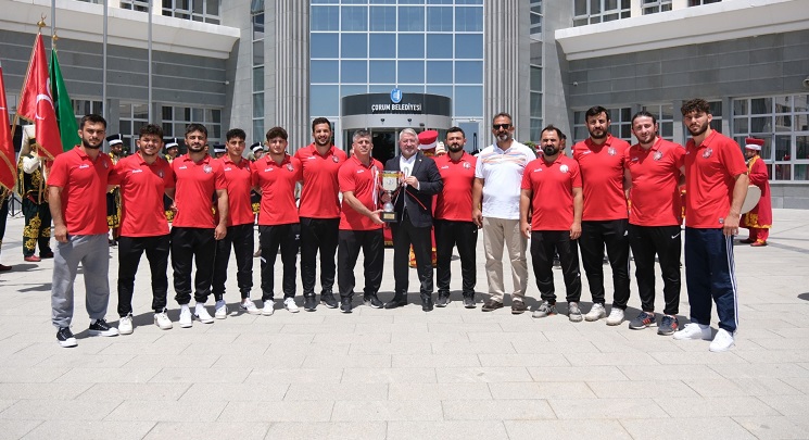 Türkiye Güreş Süper Liglerinde 2023-2024 Sezonu, geçtiğimiz Cumartesi günü Ankara’da yapılan müsabakalarla sona erdi. Süper Ligde Çorum’u temsil eden Çorum Belediyesi Spor Kulübü, serbest stilde ikinci olarak büyük bir başarıya imza attı. İkincilik kupası ile Çorum’a dönen güreşçiler Belediye Başkanı Dr. Halil İbrahim Aşgın’ı ziyaret etti. Güreşçiler için belediye binası önünde mehterli tören yapıldı.