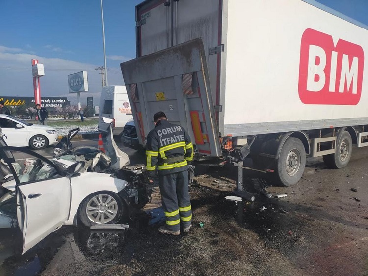 Kaza Çevreyolu Toptancılar kavşakta meydana geldi. Edinilen bilgiye göre İsmail Enes G.(26)’in kullandığı 42 KG 737 plakalı otomobil, Toptancılar kavşakta trafik ışıklarında duran sürücüsü öğrenilemeyen 34 KM 6404 plakalı kamyona arkadan çarptı. Çarpışmanın şiddeti ile kamyonun altına giren otomobilde bulunan sürücü İsmail Enes G., Ahmet S.(26) ve Ali G.(29), sıkışarak ağır yaralandı. Kazanın ihbarı ile olay yerine itfaiye, polis ve sağlık ekipleri sevk edildi. Çorum Belediyesi İtfaiye Kaza Kırım ekiplerinin çalışmaları ile sıkıştıkları yerden kurtarılan yaralılar 112 ekiplerinin ilk müdahalesinin ardından Hitit Üniversitesi Eğitim ve Araştırma Hastanesi’ne kaldırılarak acil ameliyata alındı. Kazada yaralanan üç kişinin durumlarının ciddiyetini koruduğu öğrenilirken, kaza ile ilgili soruşturma başlatıldı.