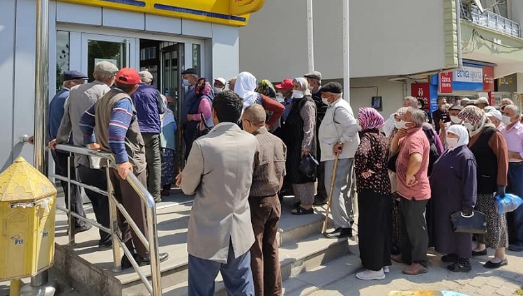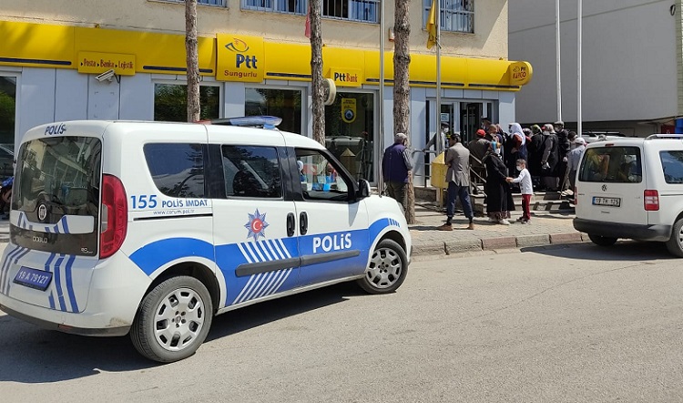 Son Güncelleme: 11 Temmuz 2020 11:56 Çorum’un Sungurlu ilçesinde, sosyal destek yardımlarının alındığı PTT şubesi önünde sıra bekleyenler, sosyal mesafe kuralına uymadı. Polis, kalabalığı sosyal mesafeye göre sıraya sokarken, bir vatandaş da kurallara uymayanlara tepki gösterdi. Sungurlu’da, sosyal destek yardımlarının temin edildiği PTT şubesi önünde sabah saatlerinde sıraya girenler, kalabalık oluşturdu.PTT şubesi önünde bekleyenlerin sosyal mesafe kuralına uymadığı görüldü. Bazı kişilerin maskesiz olması dikkat çekerken, sosyal mesafesiz kalabalık tepki çekti. Uzayan kuyruk nedeniyle sırada bekleyenler arasında zaman zaman tartışma oldu. Şube önüne gelen polis ekipleri, güvenlik görevlileriyle birlikte sosyal mesafe kuralı konusunda uyarılarda bulundu. Polislerin uyarılarıyla mesafeli olarak sıraya geçenler, içeri tek tek alındı.Sırada bekleyen bir kişi de kurallara uymayanlara tepki gösterdi. (İHA)