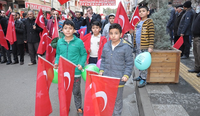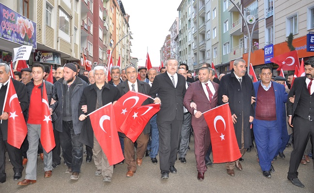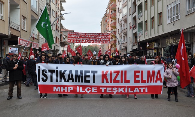 Son Güncelleme: 13 Şubat 2018 11:45 Milliyetçi Hareket Partisi (MHP) Sungurlu İlçe Başkanlığı önderliğinde, Ülkü Ocakları, Türkiye Kamu Çalışanları Vakfı ve Türkiye Kamu-Sen’in Sungurlu şubeleri tarafından “Afrin Zeytin Dalı Harekatı Kızıl Elma Destek Yürüyüşü” düzenlendi. Dispanser önünde toplanan grup, ellerinde pankart ve Türk bayraklarıyla Atatürk Meydanı’na kadar sloganlar eşliğinde yürüdü. Yürüyüş sonunda Atatürk Meydanı’nda bir program düzenlendi. Saygı Duruşu ve İstiklal Marşı’nın okunmasıyla başlayan programda Türk Eğitim-Sen Sungurlu İlçe Başkanı Ali Karslı bir şiir okudu. Şiirin ardından MHP Sungurlu İlçe Başkanı Yasin Şahin bir konuşma yaptı.