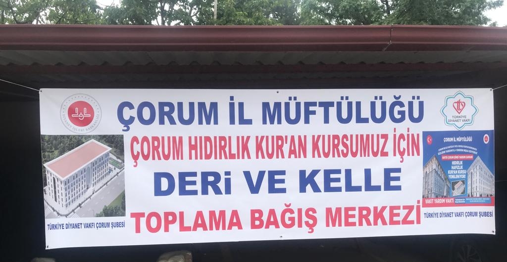 Çorum Müftülüğü tarafından yapılan açıklamada, Türkiye Diyanet Vakfı Çorum Şubesi tarafından inşaatına başlanılan Hıdırlık Yatılı Hafızlık Kur’an Kursu inşaatının bir an önce tamamlanarak eğitim öğretime açılabilmesi için, Çorum merkezinde ve köylerinde bulunan Çorum Belediyesi Kurban Kesim alanlarında, Kurban Bayramının ilk üç gününde vatandaşlardan kurban, kelle ve deri bağışlarının kabul edileceği duyuruldu.