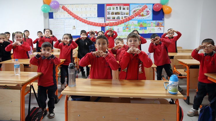 Törenin ardından öğrenciler okul bahçesinde İstiklal Marşı’nı okuyarak eğitim yarı yılını sonlandırdı. (AA)