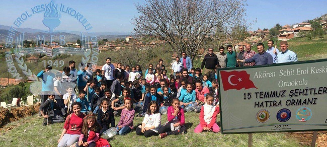 Son Güncelleme: 9 Nisan 2018 10:35 Akören Şehit Erol Keskin İlk ve Ortaokulu tarafından 15 Temmuz 2016’daki darbe girişiminde şehit olanların anısını yaşatmak amacıyla Akören köyünde 15 Temmuz Şehitleri Hatıra Ormanı oluşturuldu. Okul Müdürü Recep Çolak ve öğrenciler, hatıra ormanı sahasında 400 fidanı toprakla buluşturdu. Etkinliğe okulun ilk ve orta bölümünden 150 öğrenci ile velilerin katıldığını belirterek, “Okulun yakınında ağaçlandırma için tahsis edilen alana öğrencilerimiz fidanlarını dikti. 15 Temmuz Şehitleri Hatıra Ormanı’na gelecekte de ağaç dikmeye devam edeceğiz. Dikilen fidanlar öğrencilerimizle beraber, ormanımız da yeni fidanlarla büyüyecek.” dedi.