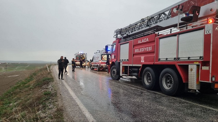 Araçta sıkışan bir kişi Alaca Belediyesi itfaiye ekiplerince çıkarıldı. Yaralanan sürücü ile S.K. (71), H.K. (21), O.K. (36) ve S.K.K. (10), sağlık ekiplerince yapılan ilk müdahalenin ardından Alaca Devlet Hastanesi’ne kaldırıldı. (AA)