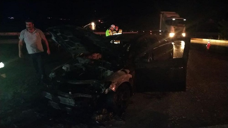 Çorum’un Osmancık ilçesinde seyir haline iken alev alan otomobil yandı. Edinilen bilgilere göre, A. Sinan K. yönetimindeki 06 BLG 858 plakalı D-100 karayolunda seyir halinde iken motor kısmından alev aldı. Araçtan dumanlar yükseldiğini gören sürücü itfaiyeye haber verdi. Kısa sürede olay yerine gelen itfaiye ekipleri yangına müdahale ederek söndürdü. Bu sırada polis ekipleri de yolu trafiğe kapatırken yangında araçta büyük çapta hasar meydana geldi.