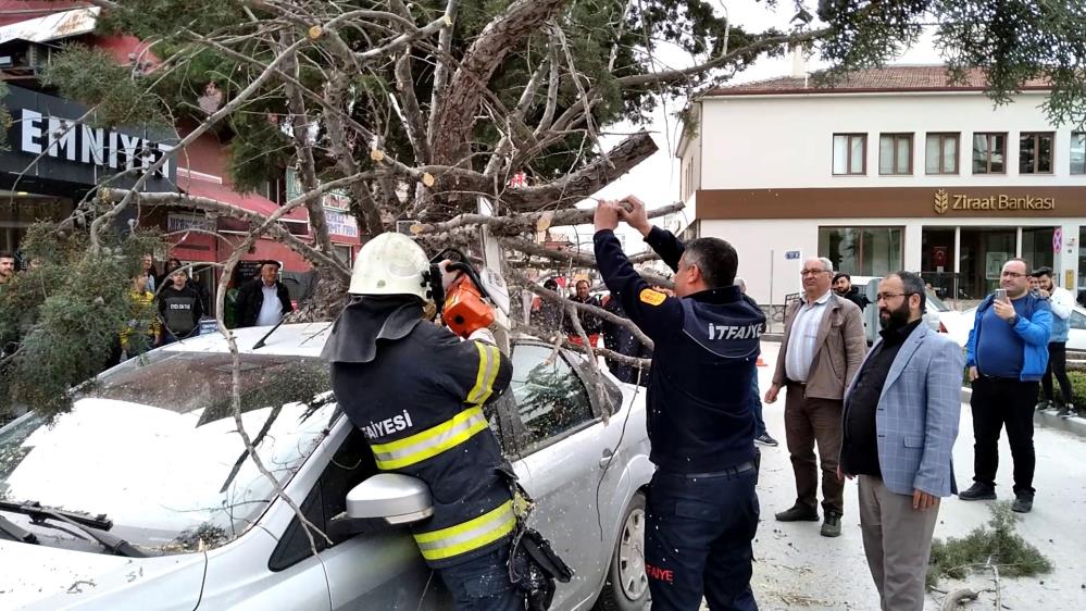 Çorum’da şiddetli rüzgar nedeniyle kökünden sökülen ağaç park halindeki otomobilin üzerine devrildi.