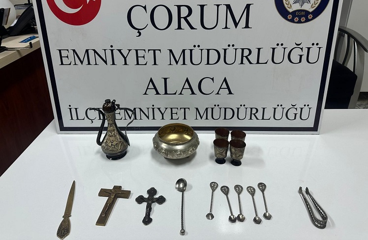 Çorum‘un Alaca ilçesinde tarihi eser kaçakçılığına yönelik operasyonda 1 kişi gözaltına alındı. Alaca İlçe Emniyet Müdürlüğü ekiplerince tarihi eser kaçakçılığı yaptığı iddia edilen B.Y. takibe alındı. Teknik ve fiziki takibin ardından düzenlenen operasyonda B.Y. gözaltına alındı. Şüpheliye ait adreste yapılan aramada, tarihi değeri olduğu değerlendirilen 2 haç ile çeşitli eşyalar ele geçirildi. Şüpheli, ifade işlemleri için polis merkezine götürüldü. (AA)