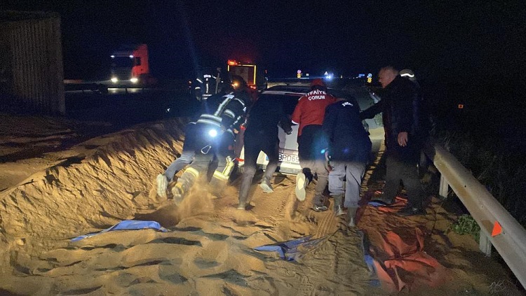 Olay yerine gelen sağlık ekipleri tarafından ilk müdahalesi yapılan yaralı sürücü, Hitit Üniversitesi Erol Olçok Eğitim ve Araştırma Hastanesine kaldırıldı. Kazada yola saçılan hayvan yemi sebebiyle Samsun istikameti bir süre trafiğe kapandı. Kapanan yolda yaklaşık 2 kilometre uzunluğunda araç kuyruğu oluştu. Ekiplerin temizlik çalışmasının ardından yol kontrollü olarak trafiğe açıldı. Ekipler, kaza ile ilgili inceleme başlattı. (İHA)