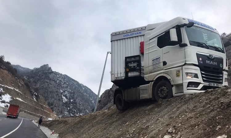 Kaza, Samsun-İstanbul D-100 karayolu Direkli (Badal) mevkiinde meydana geldi. Edinilen bilgiye göre, İstanbul’a yük götüren 06 CHK 386 plakalı tır, sürücüsünün bir anlık dikkatsizliği sonucu asfalt yoldan çıkarak tünel şantiyelerinin kurulduğu toprak alana girdi. Sürücü karayoluna tekrar dönmek isterken tırın çekicisi toprak alandaki tepenin ucunda asılı kaldı. Tırın asılı kaldığı yerden karayoluna düşmemesi facianın önüne geçti. Bir süre bulunduğu yerde asılı kalan tır, vinçler yardımıyla kurtarıldı. (İHA)