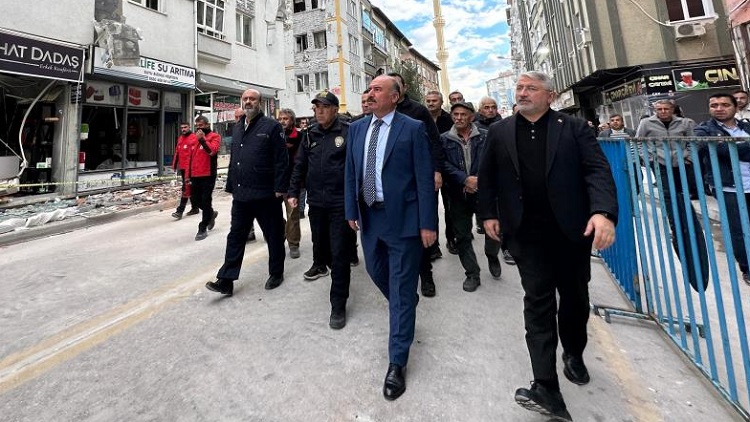 Vali Ali Çalgan ve Belediye Başkanı Halil İbrahim Aşgın, doğal gaz patlamasının yaşandığı Osmancık Caddesi’nde incelemelerde bulundu. 1 kişinin öldüğü, 33 kişinin yaralandığı patlamadan etkilenen vatandaşlar ve esnafları olay bir an olsun yalnız bırakmayan Vali Çalgan ve Başkan Aşgın, cadde esnafı ve ev sahipleri ile bir toplantı yaptı.