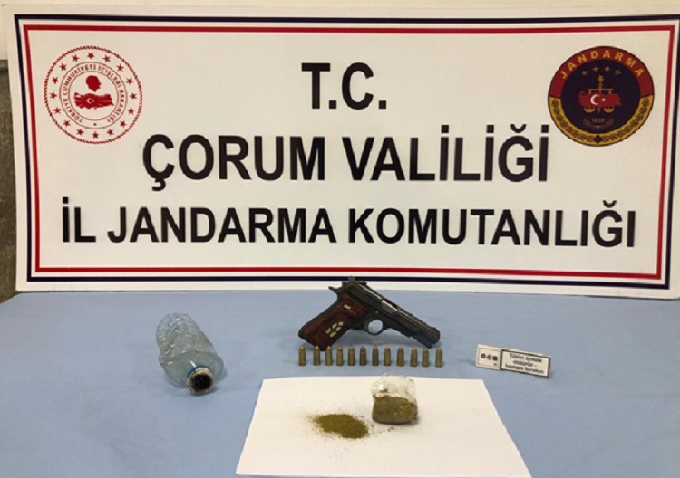Çorum İl Jandarma Komutanlığı ekiplerince şüphe üzerine durdurulan araçta uyuşturucu madde ele geçirildi. İl Jandarma Komutanlığınca uyuşturucu ve uyarıcı madde kaçakçılığı ile mücadele kapsamında yürütülen çalışmalar kapsamında Kargı ilçesinde bulunan mesire alanında bir otomobil şüphe üzerine durduruldu. İçerisinde şüpheli 3 şahsın bulunduğu araçta yapılan aramada 14 gr toz esrar, 1 adet ruhsatsız tabanca, 11 adet tabanca fişeği, 1 adet tabanca şarjörü, 1 adet uyuşturucu madde içiminde kullanılan pet aparat ve 12 adet uyuşturucu madde içiminde kullanılan sigara kağıdı ele geçirildi. Şüpheli şahıslardan 1’i sevk edildiği adli makamlarca tutuklanarak cezaevine konulurken diğer 2 şüpheli ise tutuksuz yargılanmak üzere serbest bırakıldı. Çorum Valiliğinden yapılan açıklamada, “Uyuşturucuyla mücadele kapsamında faaliyetlere aralıksız devam edilmektedir” ifadelerine yer verildi.