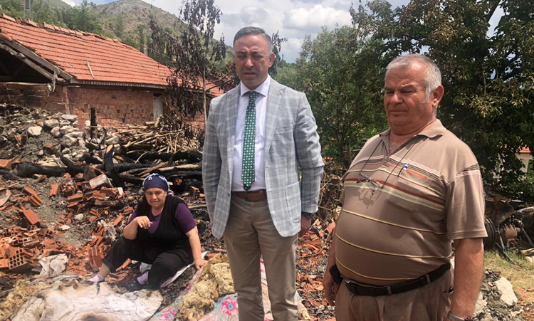 Son Güncelleme: 14 Haziran 2020 20:42 Ahmetoğlan Köyü’nde, Hanım Güneş’e ait evde henüz bilinmeyen bir sebepten dolayı çıkan yangında ev, ahır, samanlık, traktör ve ev eşyaları tamamen yandı. Can kaybının olmadığı yangında büyük miktarda maddi hasar oluştu. CHP İl Başkanı Mehmet Tahtasız, İl Yönetim Kurulu Üyeleri ve İl Genel Meclisi Grup Başkanvekili Yıldız Bek, Ahmetoğlan Köyü’nü ziyaret ederek yangın yerinde incelemeler yaptı ve yangınzedelerin sorun ve taleplerini dinledi. Sami Kılıç’ın kayın validesi 86 yaşındaki Hanım Güneş’in evinde çıkan yangında evde kimsenin olmaması tek teselli oldu. Köy muhtarı Mehmet Kantar ve yangınzede aileden durum hakkında bilgi alan CHP İl Başkanı Tahtasız, hasar tespitlerinin yapılması, yaraların en kısa zamanda sarılması için gereken yardım ve desteği sağlayacaklarını bildirdi. Geçmiş olsun dileklerini ileten Tahtasız, Muhtar Mehmet Kantar’a da ilgisi ve desteğinden dolayı teşekkür etti. Muhtar Kantar ve yangınzede aile ise CHP İl Başkanı Tahtasız ve beraberindekilere bu zor günde yanlarında olduklarından dolayı teşekkür ettiler.