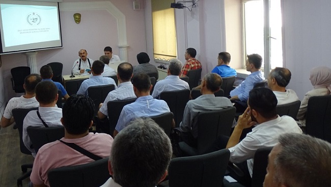 Beyaz bayrak ve beslenme dostu okul sertifikası alan okullara yenilerinin eklendiği ve yeni sertifikalar için bir tören düzenleneceğini de açıklayan Atcıoğlu, şu an proje kapsamında bir gurup öğrencinin Almanya’da olduğunu, TÜBİTAK projesi ile Türkiye 2.’liği derecesi elde edildiği bilgisi paylaşıldı. Atcıoğlu yaptığı konuşmada üç ayrı okul inşaatının sona geldiğini kız imam hatip lisesinin geçici kabul aşamasında olduğunu Aşağı Örenseki köy okulunun çevre düzenlemesinin yapıldığını ve mesleki ve Teknik Anadolu Lisesi inşaatı ile birlikte yeni eğitim öğretim yılına yetişeceğini söyledi. Okul pansiyonlarında iyileştirmelerin devam ettiğini de kaydeden Atcıoğlu, yemekhanelere perde ve masa örtüleri ile donatıldığını kaydederek, “Yeni yapılan okullarımız ile planlanan bazı okullar ve pansiyonlarımız gelecek yıl doğal gaz dönüşümü ile rahat bir ısınma sistemine kavuşacaktır” dedi. Daha sonra toplantı da söz olan Şube Müdürü Fatih Okumuş ise insan kaynakları, maaş, ekders ve yapılması gereken işlemler ile taşeron işçiler hakkında okul müdürlerini bilgilendirdi. Ekders ve maaşların hesaplanmasında yeni döneme girildiğini bildiren Okumuş, konuşmasının sonunda idareler arası yazışmalara da dikkat çekerek, yazışmaların zamanında olması gerektiği hatırlattı.