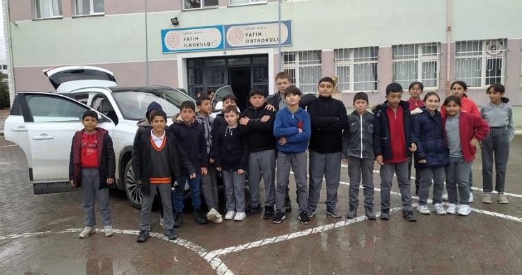 Programın en heyecanlı anı ise Milli Eğitim Müdürlüğü Alaca Şube Müdürü Beytullah Atılgan’a ait yerli otomobil Togg’un okul bahçesine getirilmesiyle yaşandı. Öğrenciler, büyük bir merakla yerli üretim otomobili inceleme fırsatı buldu. Togg’u yakından görme şansı bulan öğrenciler, aracı büyük bir ilgiyle inceledi.